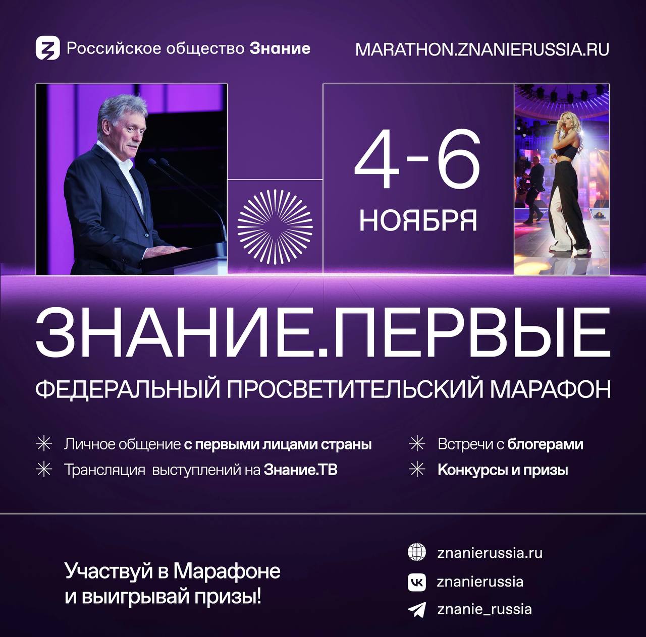 С 4 по 6 ноября 2023 года состоится Федеральный просветительский марафон Российского общества «Знание» — Знание.Первые. Марафон стартует в день открытия Международной выставки-форума «Россия» на ВДНХ в Москве и будет проходить на шести площадках в разных павильонах.